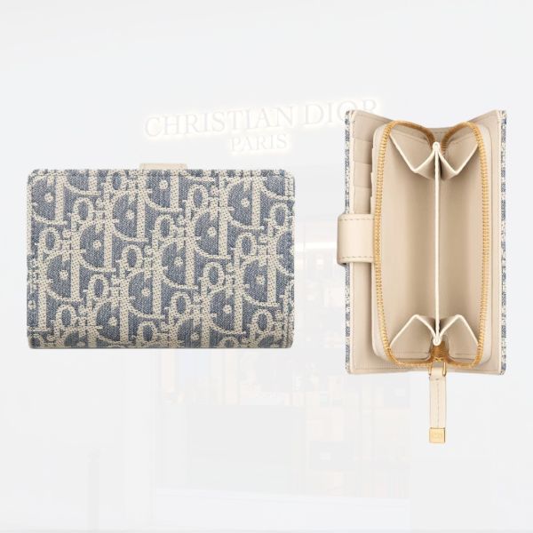 30 Montaigne 'Dittany' 皮夾採用雙折設計。淺餅乾米色光滑小牛皮和輕質棉質牛仔布與藍色錢布雷布相結合,上面繡有標誌性的 Dior Oblique 圖案,採用堅固的拉菲草線。正面飾有古樸的金色金屬 CD 簽名。這款高功能皮夾可方便存放各種必需品,並可與該系列的其他物品搭配使用。