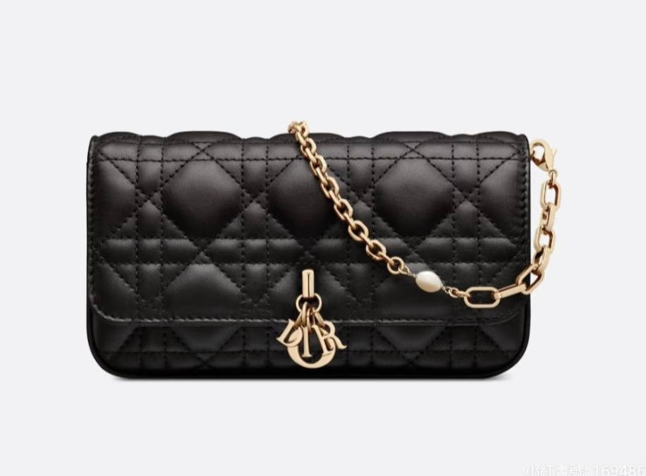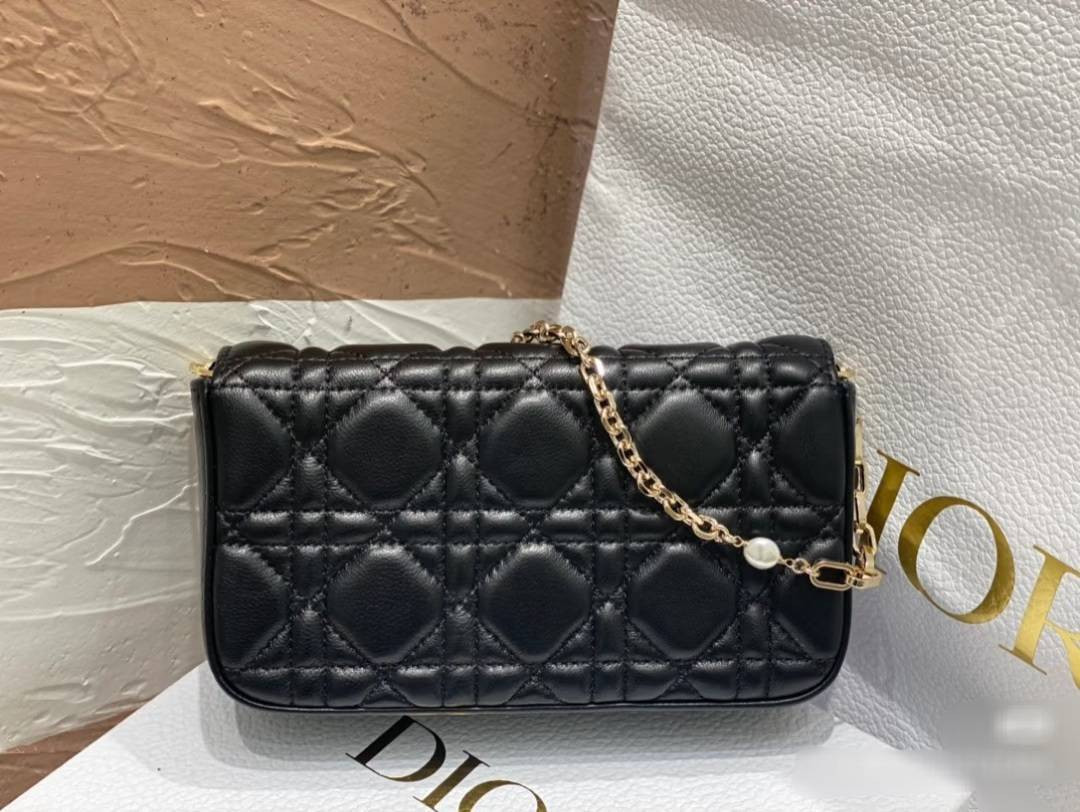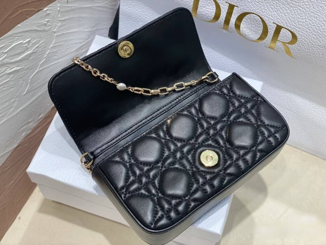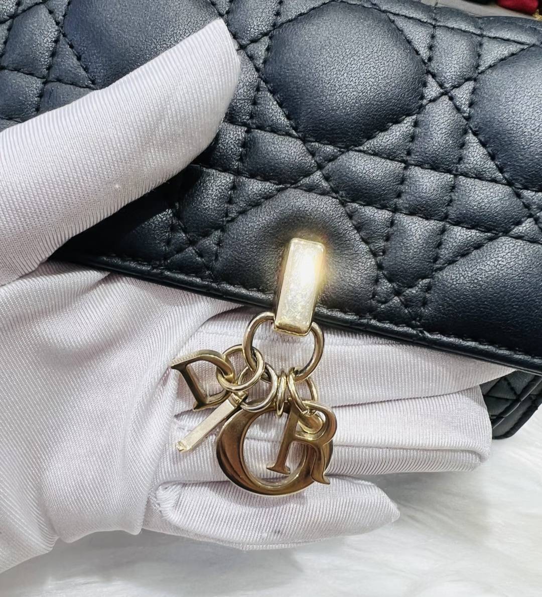 以黑色羊皮製作,點綴 Cannage 籐格紋縫線,並飾有 D.I.O.R. 吊飾,散發時尚而雋永的魅力。