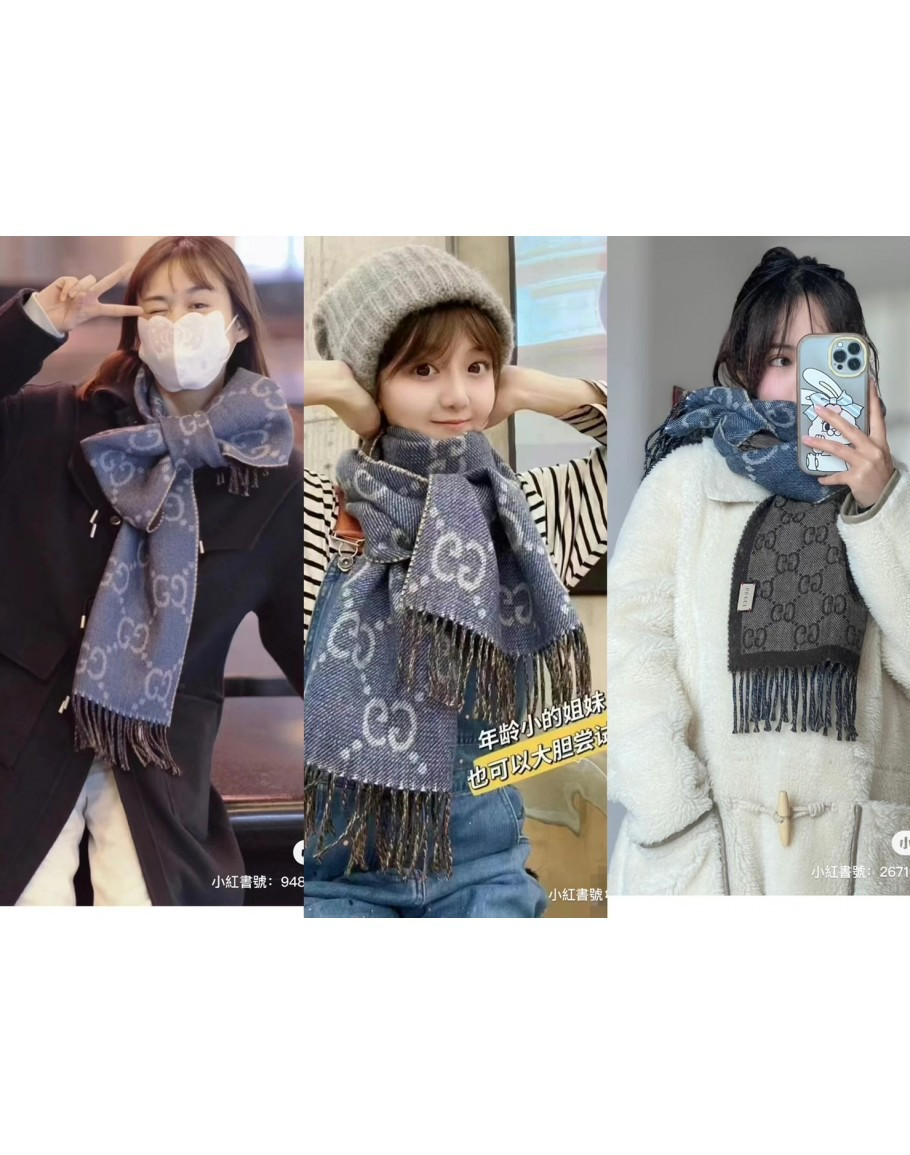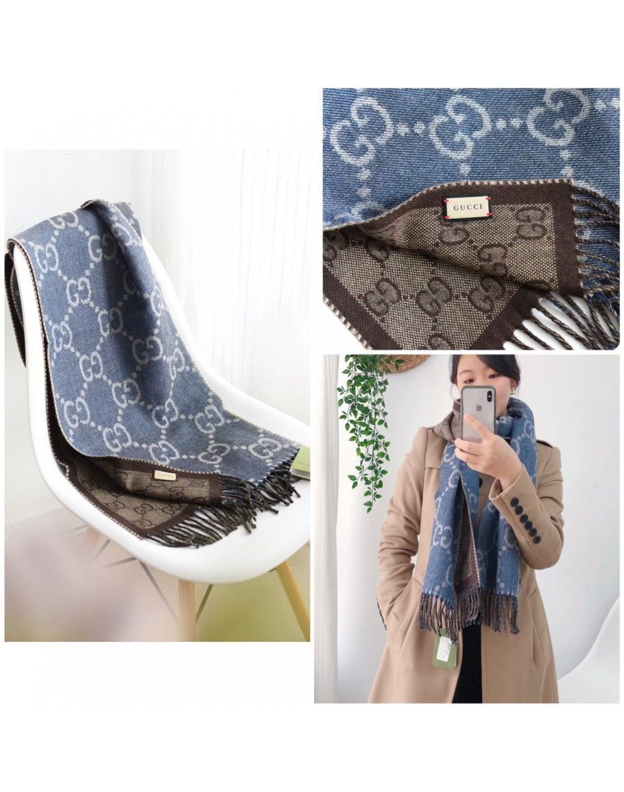 日本GUCCI 雙面GG LOGO羊毛流蘇圍巾 牛仔藍*深咖