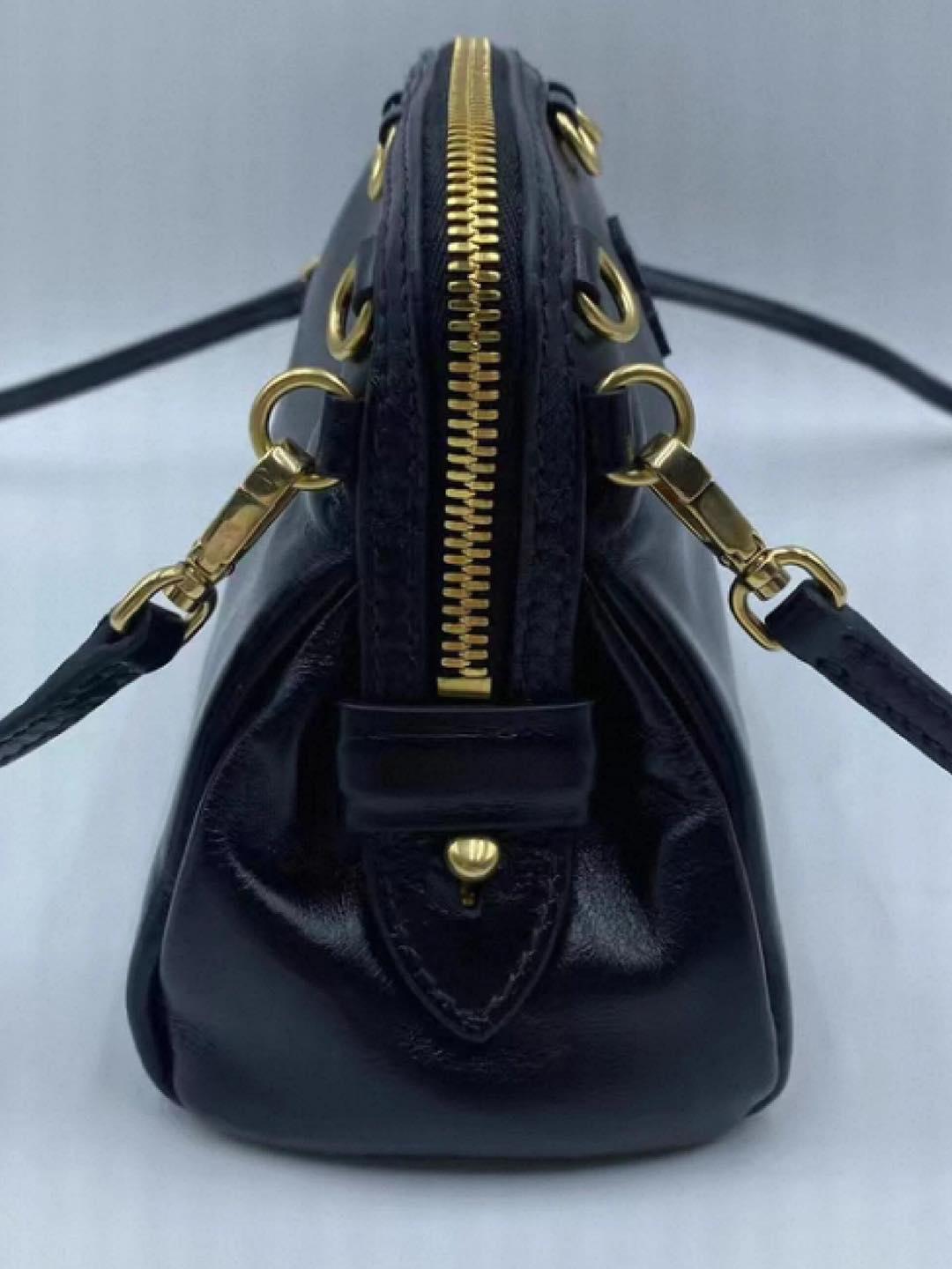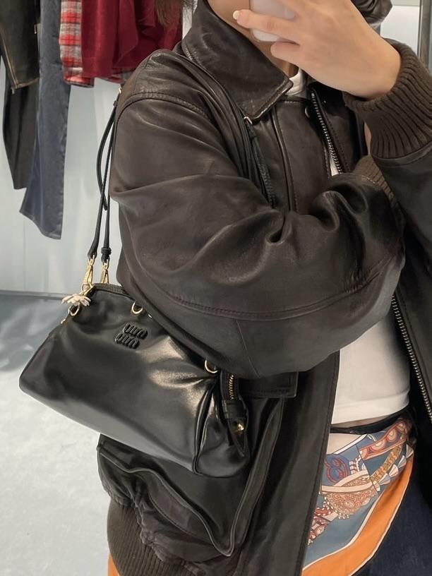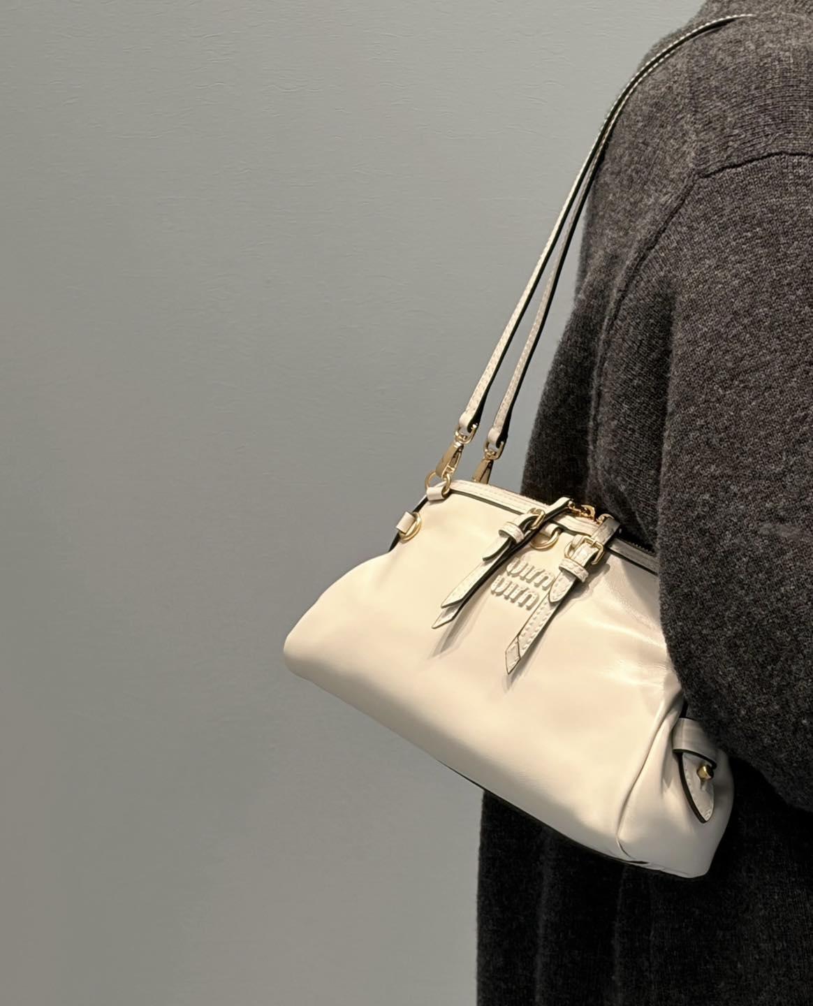 包身兩側的金色圓環扣+皮革抽繩,是Miu Miu標誌性的復古細節,